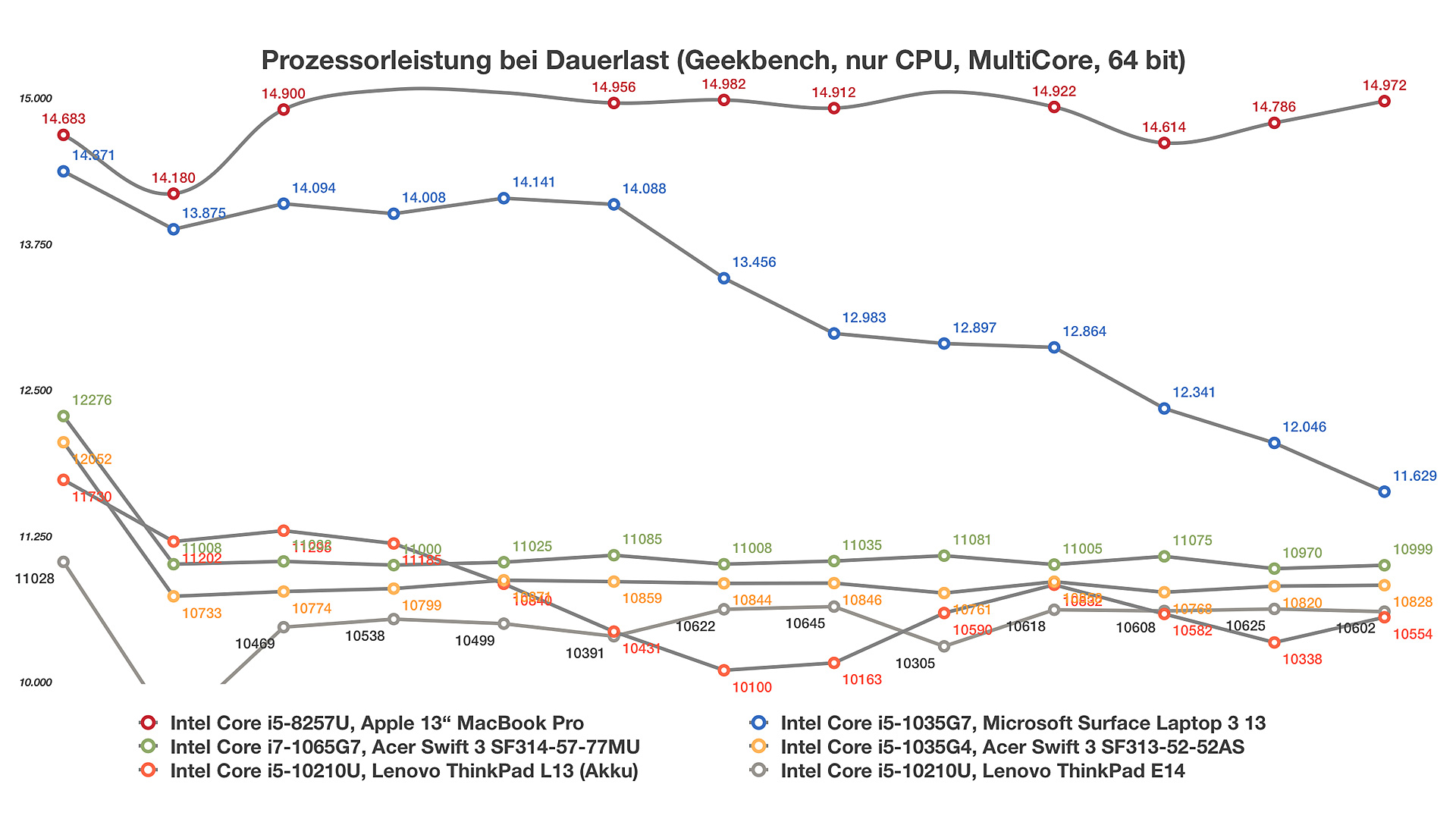 Im Dauerlastszenario weicht Acer von seinem Konzept nicht ab und gesteht dem Intel Core i5-1035G4 durchgängig seine 15 Watt zu. Mit Ergebnissen von um die 10.800 Punkten beim Geekbench-CPU-Stresstest positioniert sich diese Lösung vor den beiden Intel Core i5-10210U aus dem Lenovo ThinkPad E14 und dem Lenovo ThinkPad L13. Deutlich flotter ist in diesem Szenario zum Beispiel der Intel Core i5-1035G7 aus dem Microsoft Surface Laptop 3 13 unterwegs, der wesentlich länger eine höhere Verlustleistung fahren darf.
