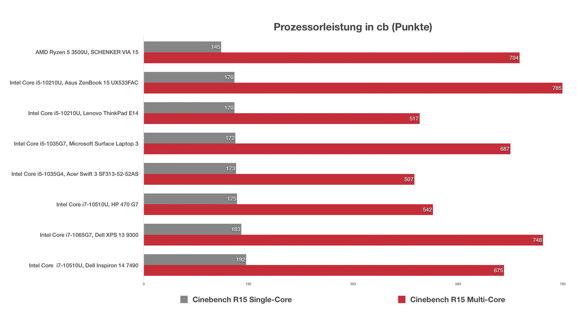 Die Single-Thread-Performance kann sich gegenüber der Konkurrenz zwar nicht ganz so gut in Szene setzen, verweist aber immerhin den AMD Ryzen 3500U aus dem Schenker VIA 15 eindrucksvoll auf die Plätze.