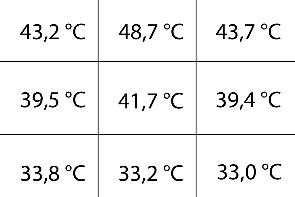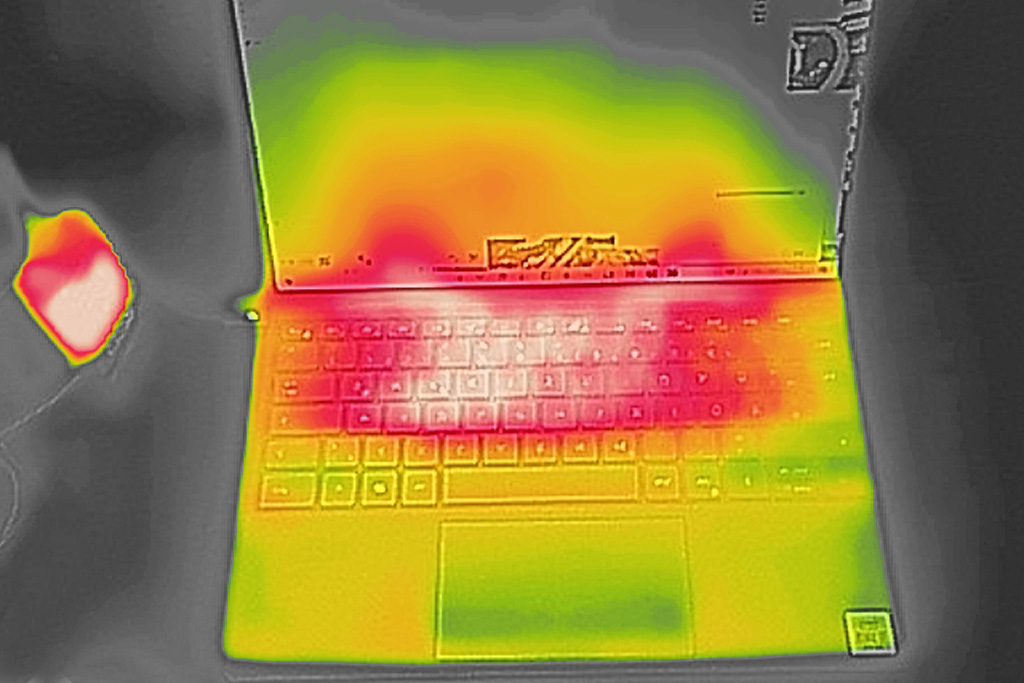 Die Gehäusetemperaturen verharren auch nach über 1 Stunde Stresstest in einem unproblematischen Rahmen. Im Arbeitsbereich sind maximal 48,7 °C und am Unterboden maximal 46,5 °C aufgetreten. Beim Laden des Akkus erwärmt sich das kleine 45-Watt-Netzteil auf bis zu 56,9 °C. Ansonsten treten maximal 49,6 °C auf.