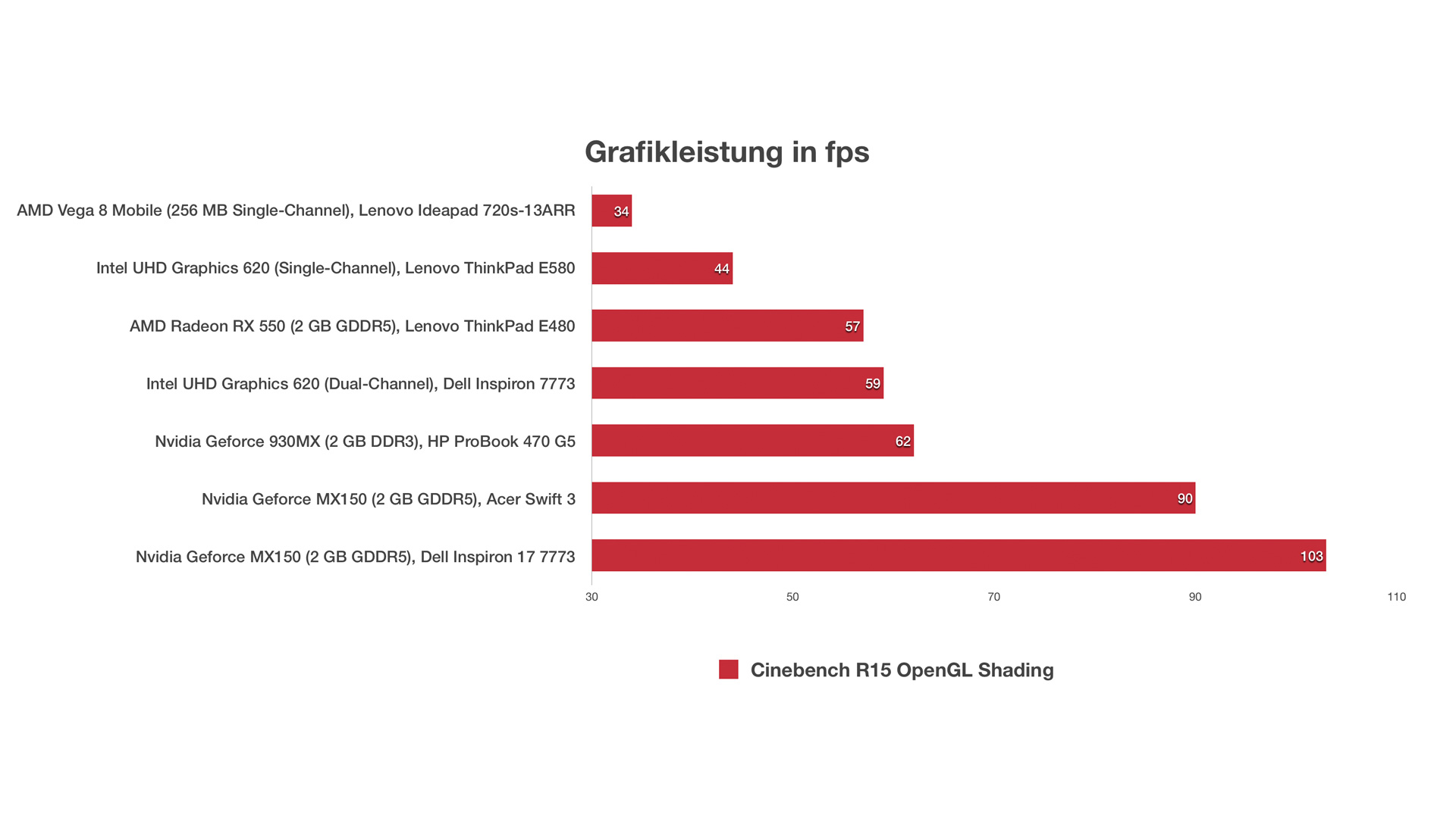 Leistungsmäßig trennt beide Lösungen nicht viel voneinander. Bei den Unigine-Heaven-Tests beträgt der Unterschied 2 bis 5 fps und beim Cinebench R15 OpenGL-Shading schafft die Nvidia Geforce 930MX 62 anstatt 59 fps.