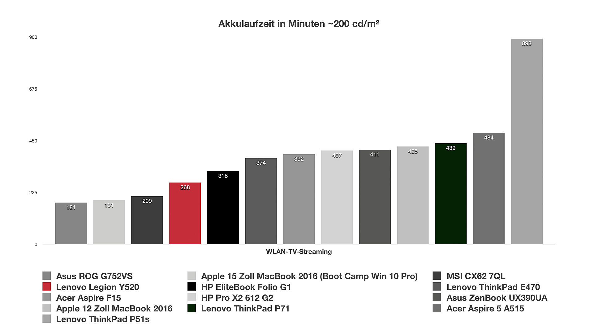 WLAN-Streaming (198 cd/m², ausgeglichenes Profil) | 10,2 – 11,8 Watt | 4:28 h |