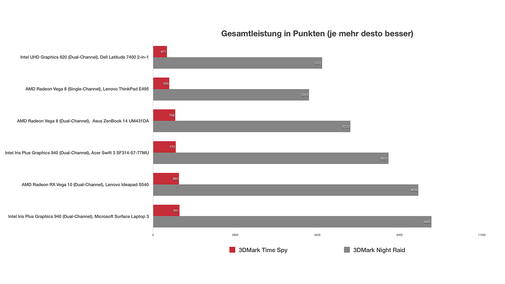 Beim Testgerät kann die volle Leistungsfähigkeit nicht abgerufen werden, da der eine verbaute 8-GB-RAM-Riegel im Single-Channel-Modus arbeitet. Mit einem zweiten Speichermodul kann dieses Problemchen allerdings schnell behoben und eine Performance auf dem Niveau des Asus ZenBook 14 UM431DA erzielt werden.