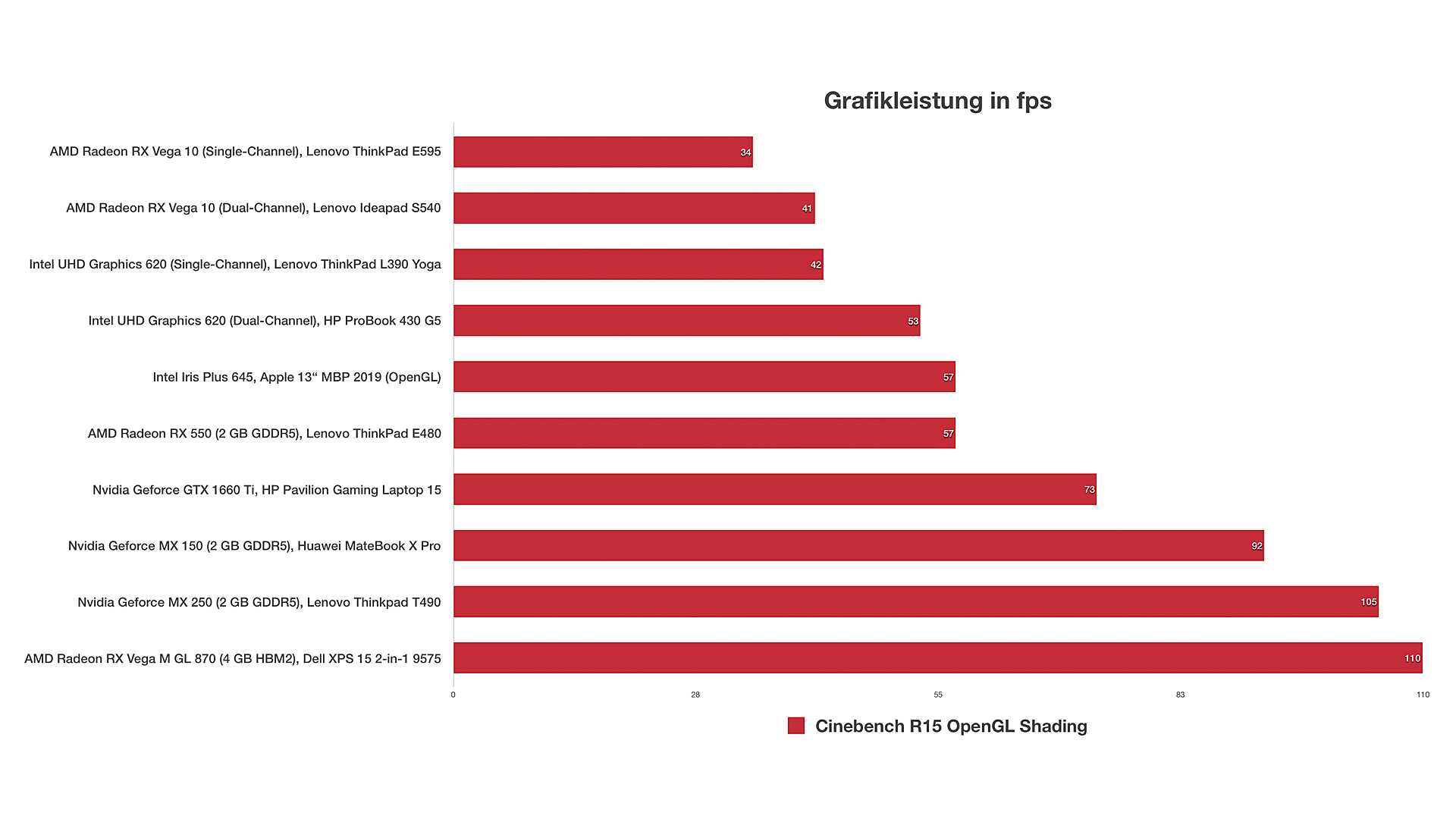 Im Test erreicht das Lenovo ThinkPad E595 zum Beispiel 28 fps beim Unigine Heaven Basic (DX9) oder 7.440 Punkte beim 3DMark Night Raid (DX12). Obwohl die Ergebnisse hier deutlich besser ausfallen, als bei vergleichbaren Konfigurationen mit Intel UHD Graphics, reicht die Leistungsfähigkeit nicht aus, um aktuelle 3D-Titel ausreichend flott über den Bildschirm zu bewegen.