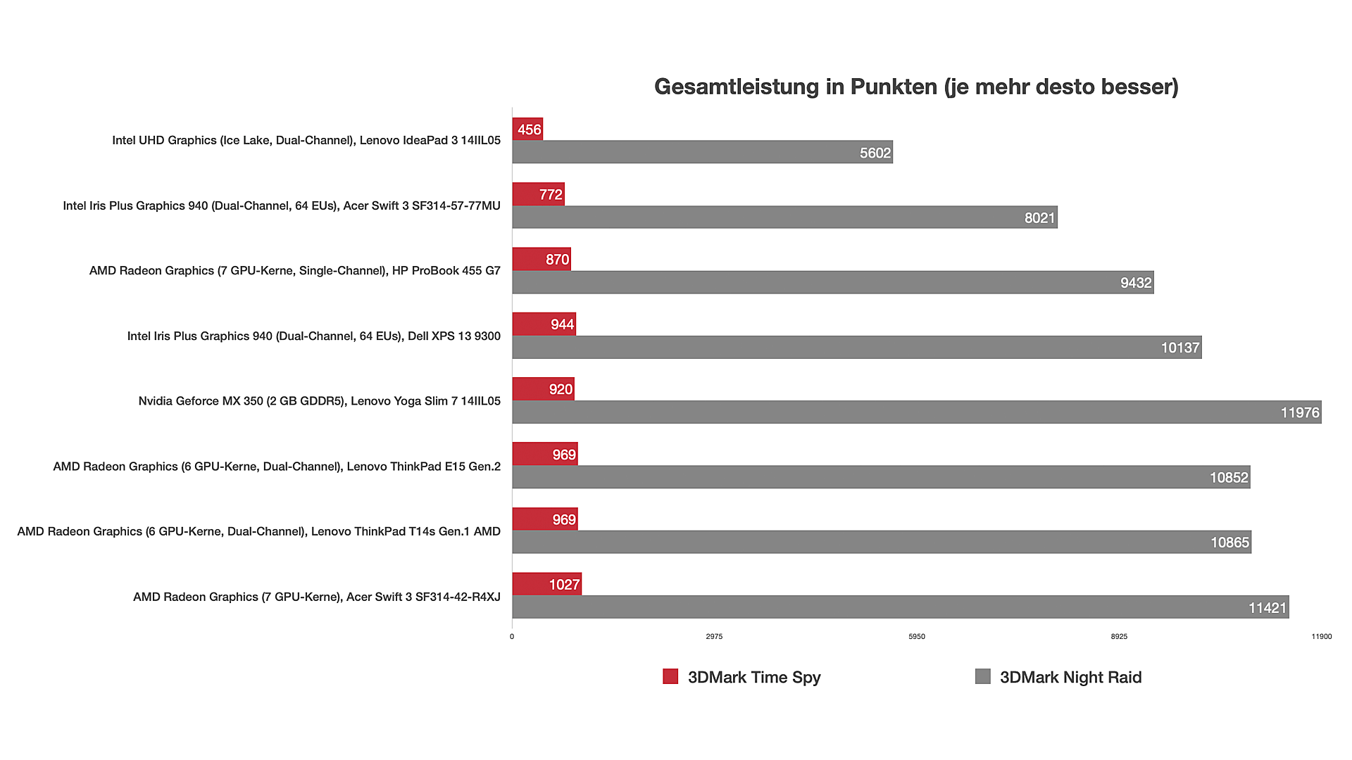 Beim 3DMark Night Raid erzielt die Testkonfiguration 10.865 Punkte und beim 3DMark Time Spy 969 Punkte.